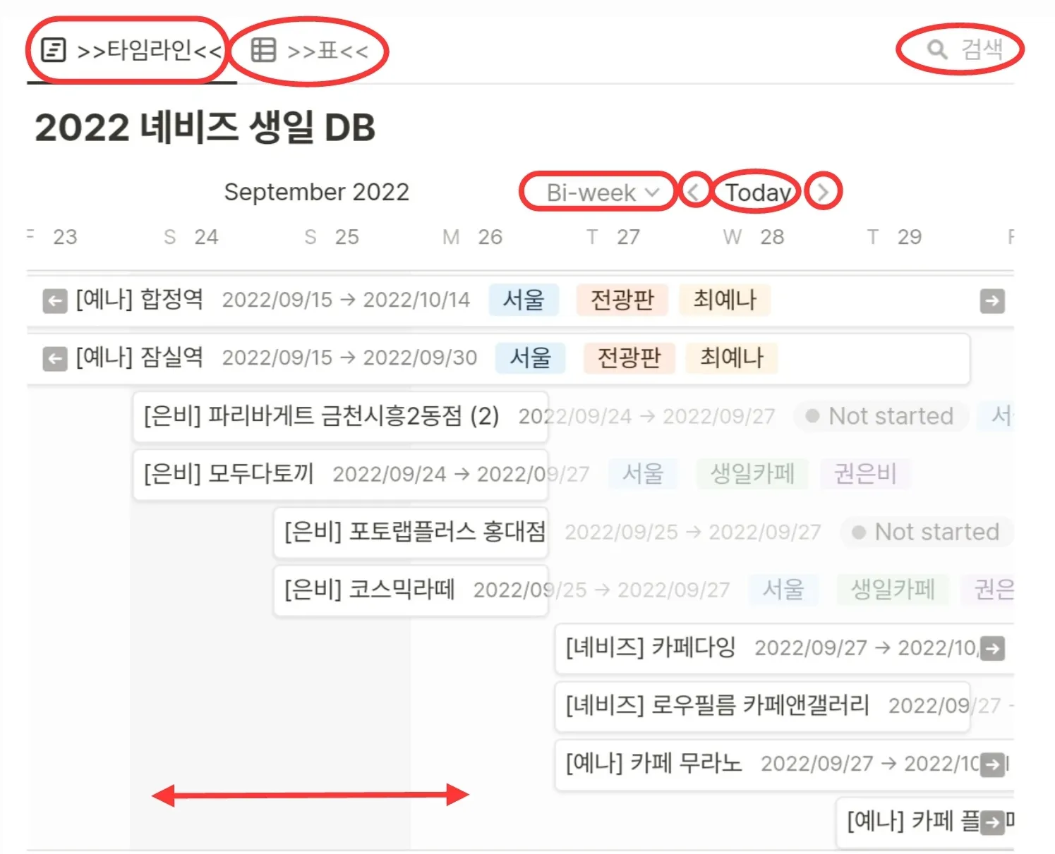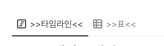 왼쪽 상단에 “타임라인” 과 “표” 두가지 정렬방식이 위치해있습니다.